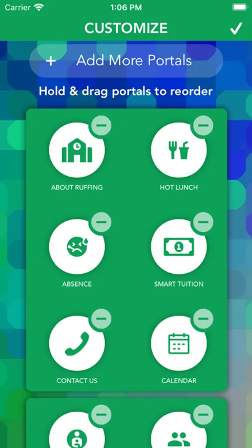 Your Ruffing Montessori app is fully customizable by you: Rearrange your portals to easily access whichever features you use most. If you want to check school events frequently, you can put that portal front and center. If you never check school social media, you can turn that portal off.