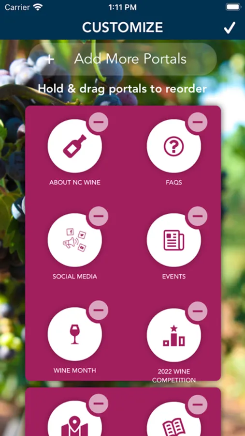 Your NC Wine app is fully customizable by you: Rearrange your portals to easily access whichever features you use most. If you want to check local events frequently, you can put that portal front and center. If you never check NC Wine social media updates, you can turn that portal off.
