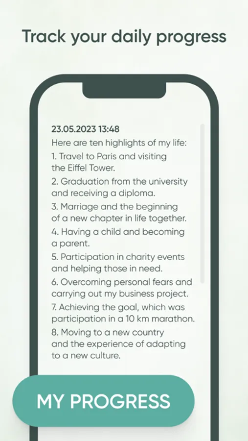 All your completed exercises are saved, allowing you to track your progress and witness the incredible transformation you're achieving while growing toward your goals.