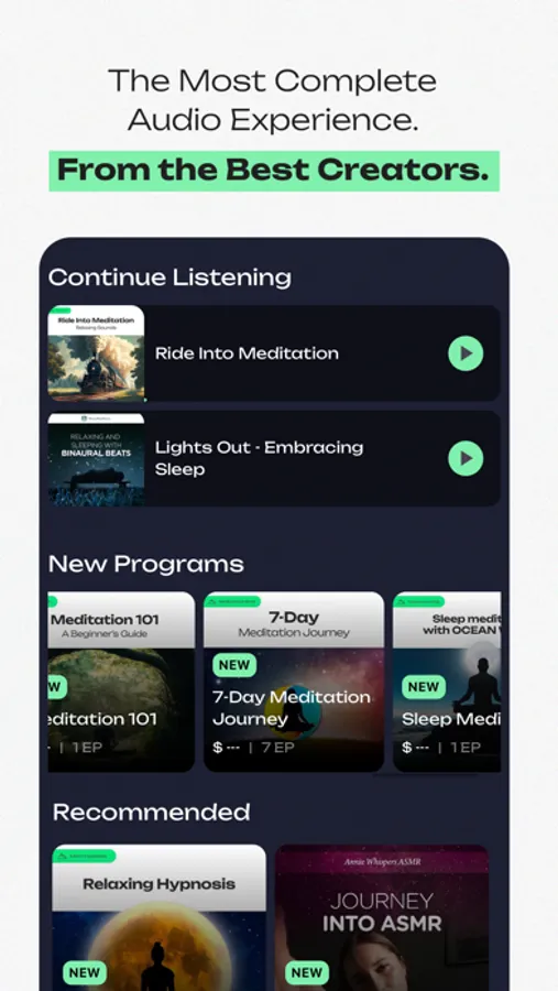 Take your meditation practice to new heights with Peak.audio – the ultimate app for Meditation and Mindfulness. Embrace a new level of tranquility, reduce stress, and achieve mental clarity with our extensive library of guided meditations, hypnosis, relaxing sounds, ASMR experiences, personal growth programs, and more.