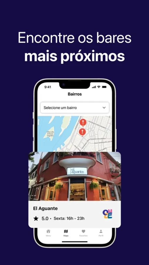 Com o nosso mapa interativo, você pode localizar bares próximos e também explorar bairros diferentes. Ao clicar nos pins do mapa, você pode acessar a página do bar.