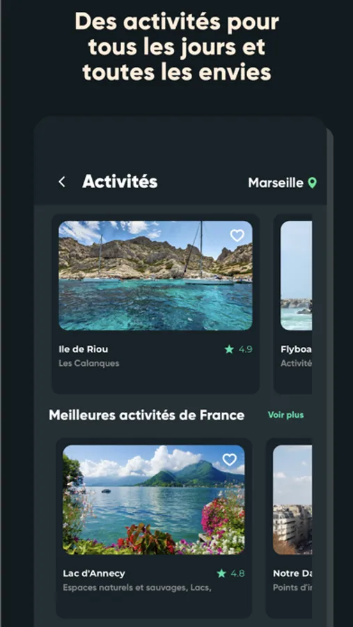 Les utilisateurs peuvent trouver des activités de différents types telles que des sites historiques, les randonnées, les parcs d'attractions et plus encore. Profitez des filtres pour vous faciliter les recherches et trouvez l’activité qui vous correspond.