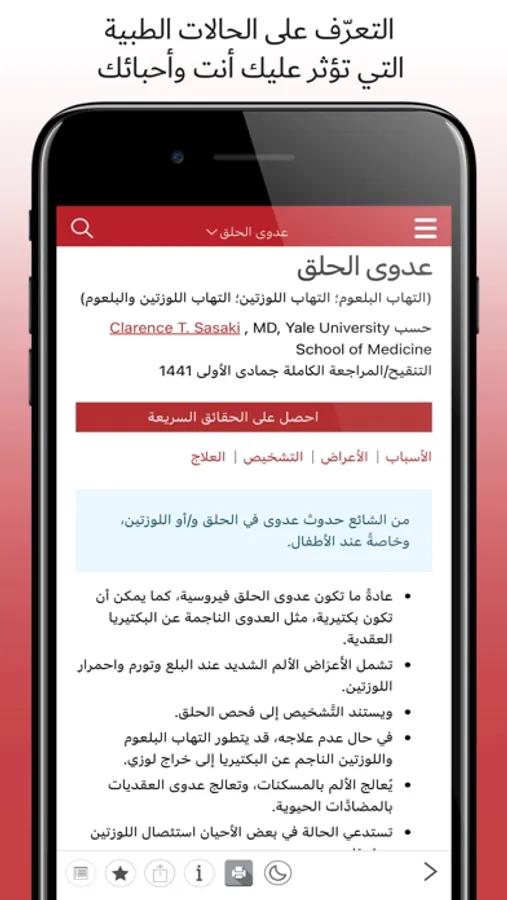 • موضوعات قابلة للبحث حسب الأعراض أو التشخيص أو العلاج، وكلها مكتوبة بلغة سهلة الفهم