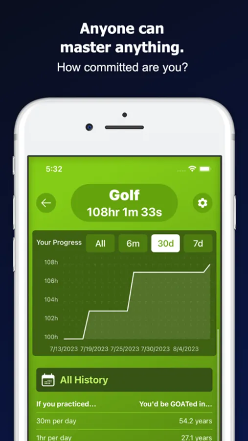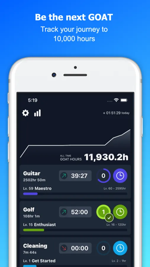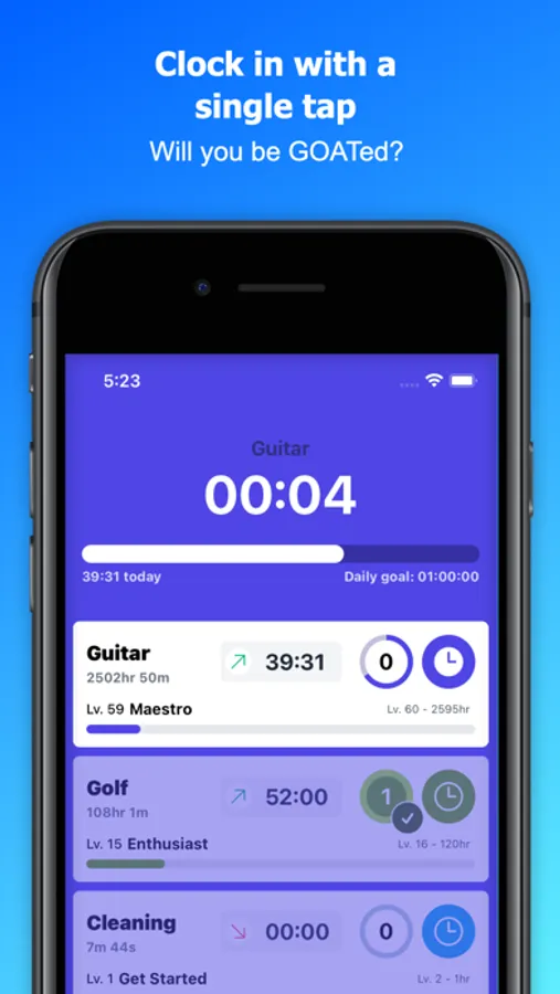 Track your journey to 10,000 hours and become one of the GOATs, or Greatest Of All Time. Anyone can master anything, it just takes daily consistent effort. Will you be the next GOAT?
