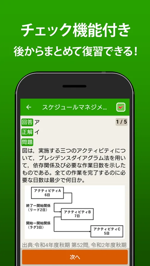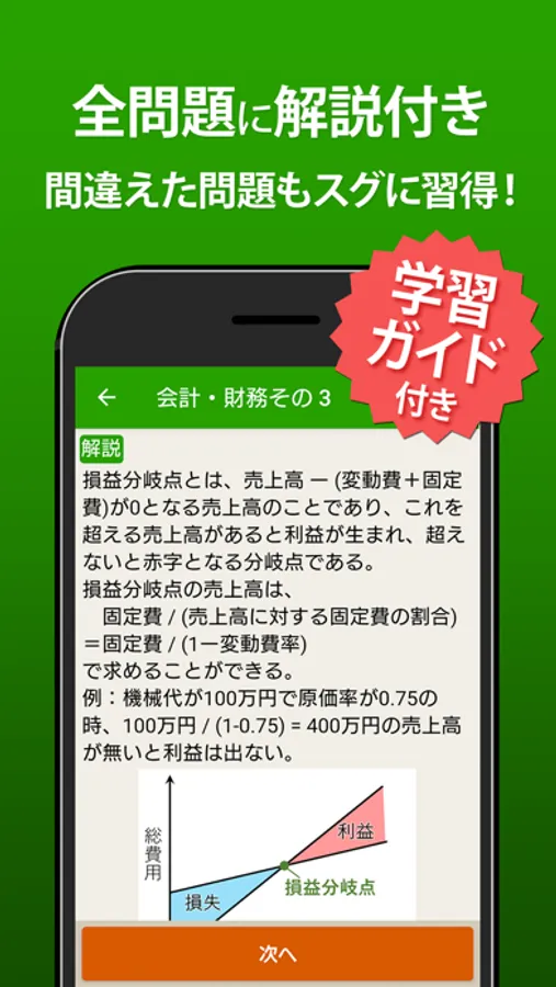 全問題に解説付き。さらに気になる問題を後からまとめて復習できるチェック機能も搭載。