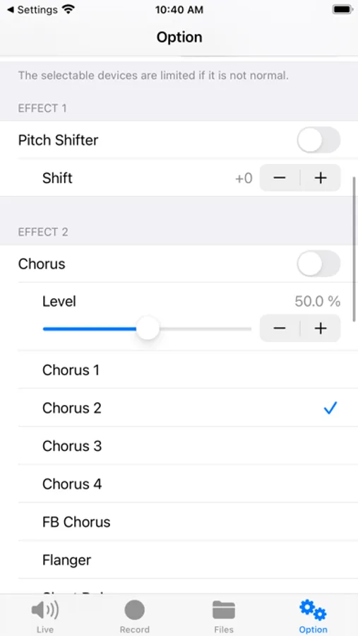 The app comes with four built-in effects. Stereo input is available on compatible devices only.