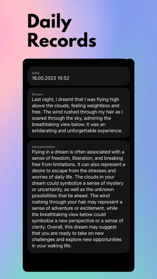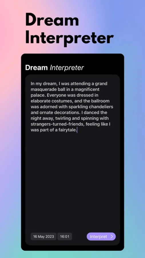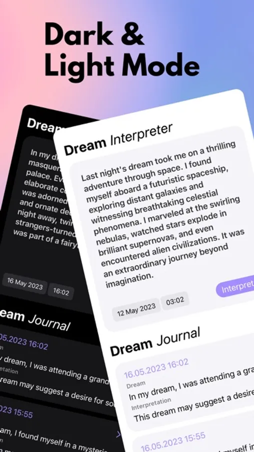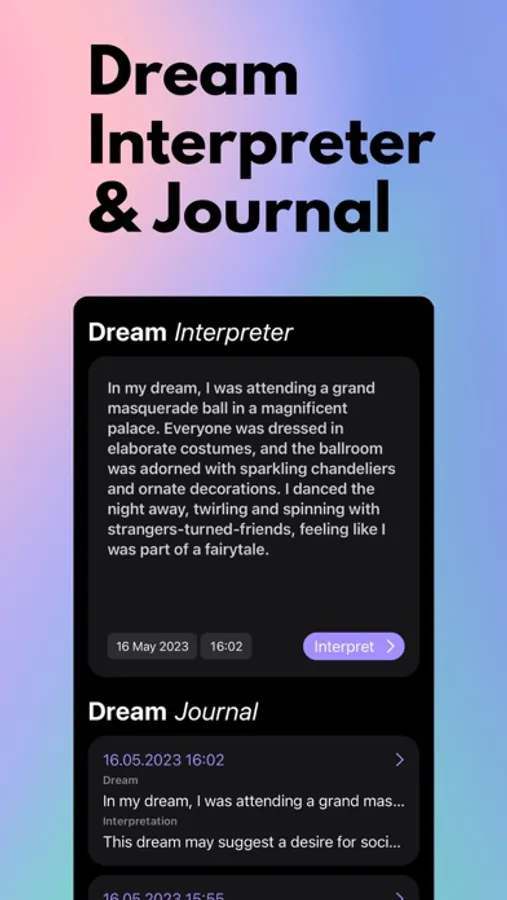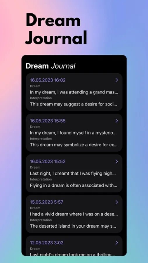 Dream Interpretation: Dive deep into the realm of dream symbolism and uncover the meanings behind your dreams. Dream Dictionary & Journal analyzes your dream journal entries, providing personalized interpretations to help you understand the emotions, fears, desires, and messages embedded within your dreams. Gain a greater understanding of yourself and your life's path as you unlock the secrets of your subconscious mind.