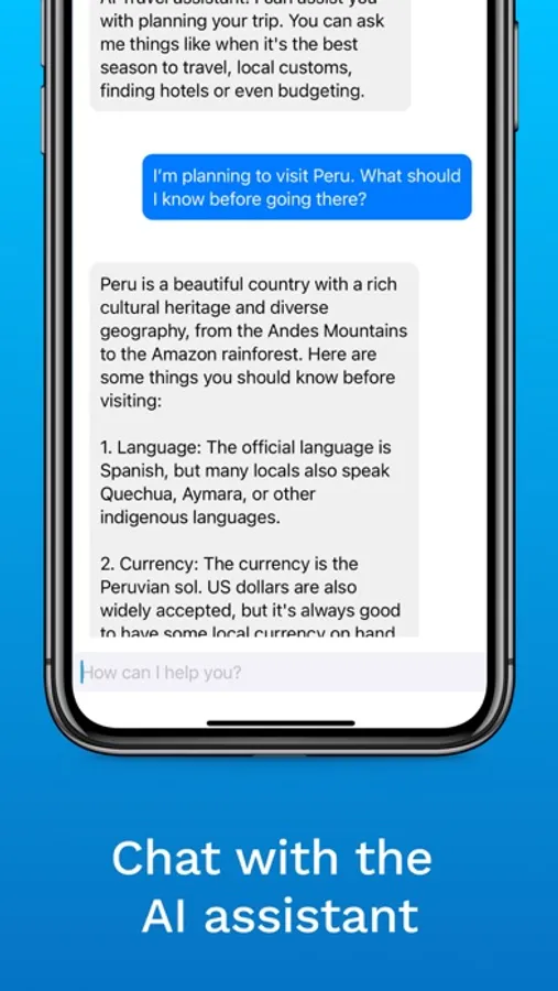 · Chat with the AI. Ask about recommendations, hotels, budget, time to travel or anything that bothers you to plan your trip in the best way.