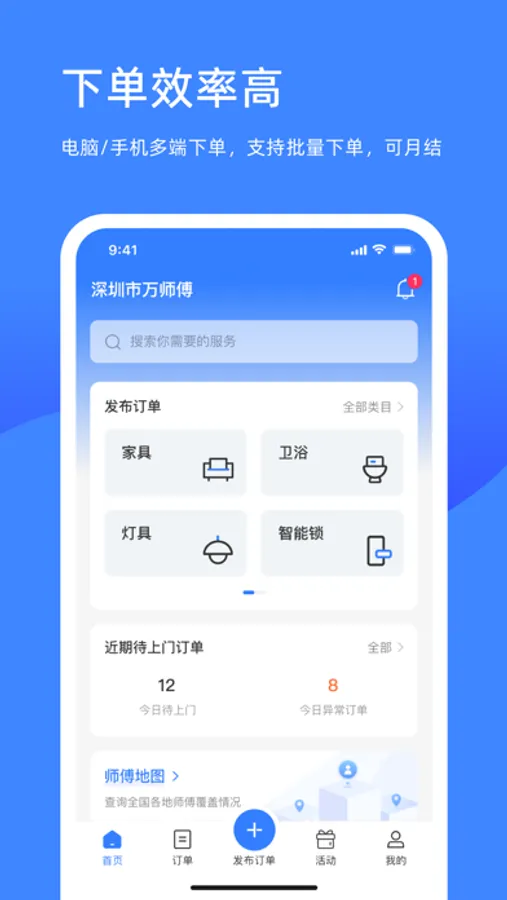 万师傅家居服务平台,创立于2013年,是一个互联网家居服务平台,通过大数据、智能算法与AI技术,提供全国范围内的配送、安装、维修、清洗、疏通等家居服务。我们致力于为商家、师傅及消费者搭建一个“品质、高效、有温度”的平台,推动家居服务业数智化升级。