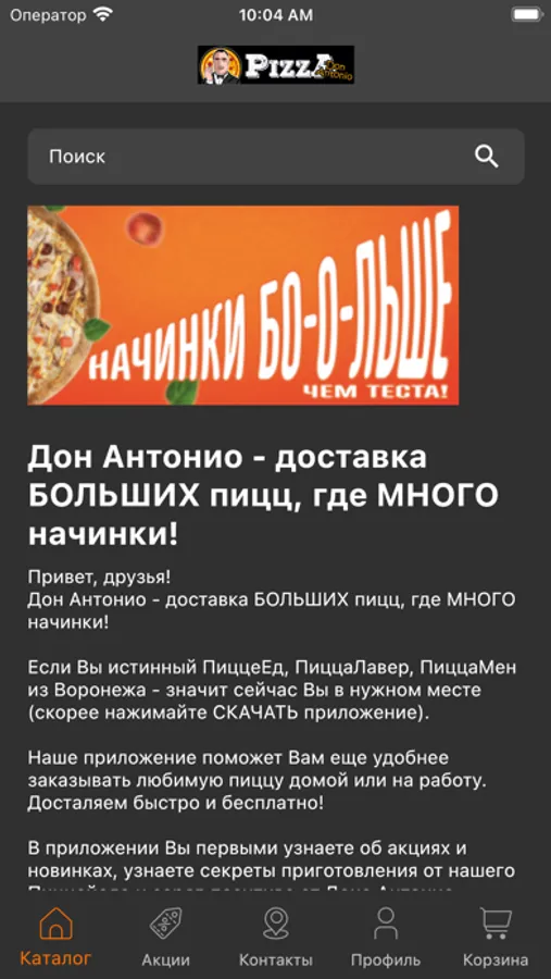 В приложении Вы первыми узнаете об акциях и новинках, узнаете секреты приготовления от нашего Пиццайоло и заряд позитива от Дона Антонио.