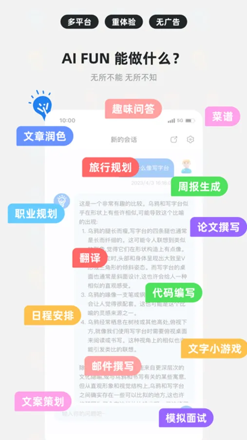 欢迎使用AiFun,AiFun是一款基于人工智能技术的聊天交互应用,它可以通过AI自然语言处理等技术与用户进行智能对话,并支持用户自定义问答、聊天内容。无论您是一位在校学生,还是一位职场新人,亦或者深耕某行业很多年的老鸟,在生活、学习、工作各个方面中,都能在AiFun中找到能够帮助自己的部分。真诚的希望AiFun能够在人生的道路上助您一程。
