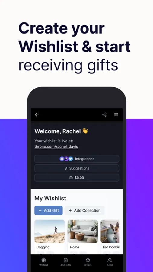 Throne is the number 1 global wishlist platform, trusted by 250,000+ creators in over 80 countries. Here is how it works: