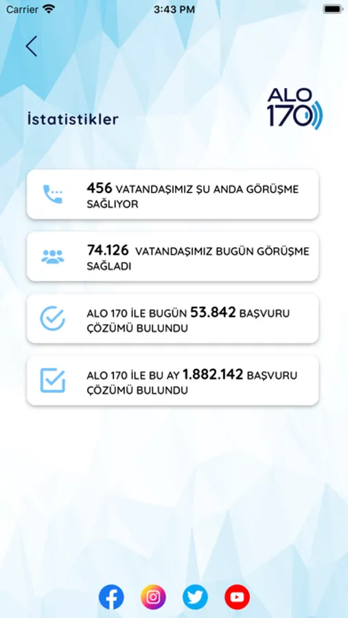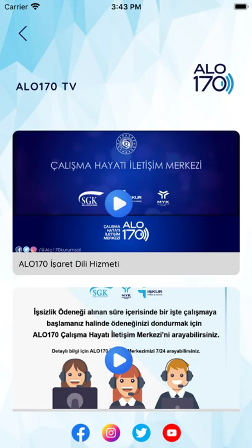 Çalışma Hayatı İletişim Merkezi Alo170, hükümetin resmi uygulamasıdır. Alo170 çalışma hayatı iletişim merkezi hakkında bilgilere erişmenizi sağlar. Uygulama içinde istatistikler, sıkça sorulan sorular, bilgi verici videolar ve güncel haberler bulunur. Giriş yaparak canlı destek alabilir, görüntülü görüşmeler yapabilir ve yeni başvurular oluşturabilirsiniz. Başvurularınızın durumunu da takip edebilirsiniz.