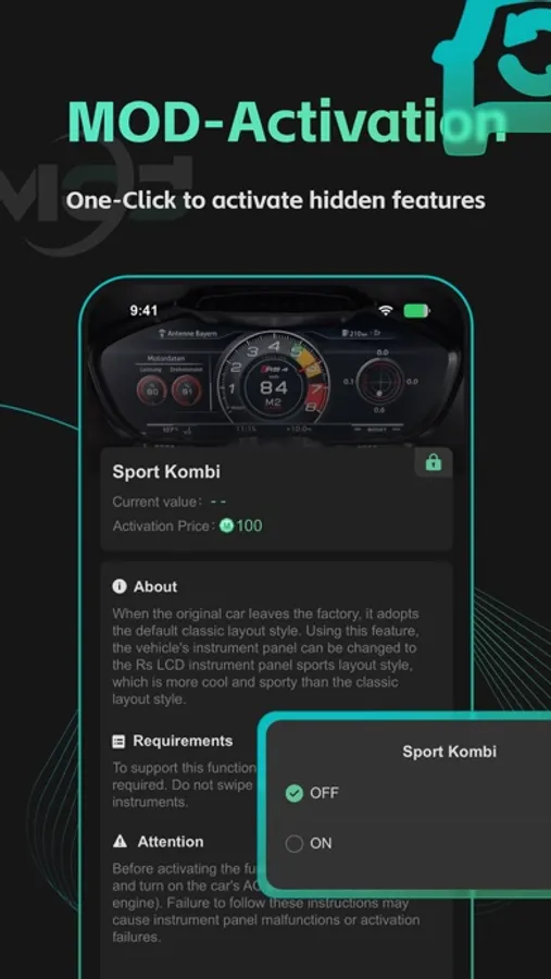MOD-Activation is a unique MotorSure feature that allows you to enable or disable various hidden, comfort, safety, and driving-related functions. With no programming knowledge required, these pre-made programming functions will quickly adjust your car's comfort or performance, personalizing your driving experience.