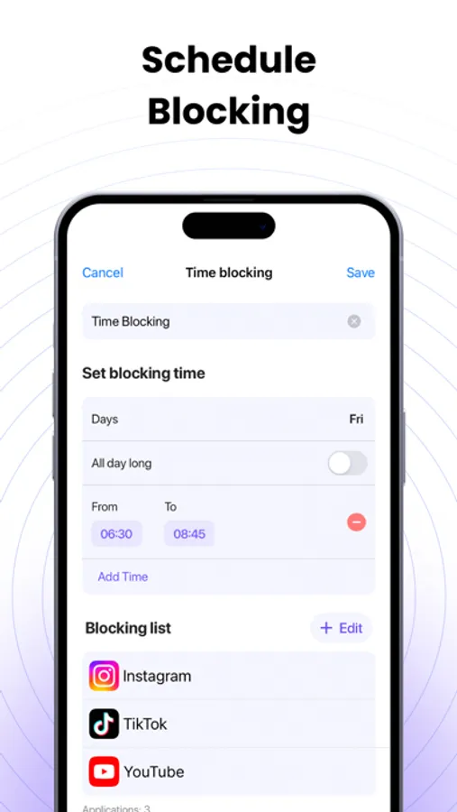 Our app's social media blocker feature enables you to curb your digital consumption, providing you with offtime that you can utilize for other essential tasks. With "Focus Mode," you can beat the addiction to your phone screen and enhance your productivity.