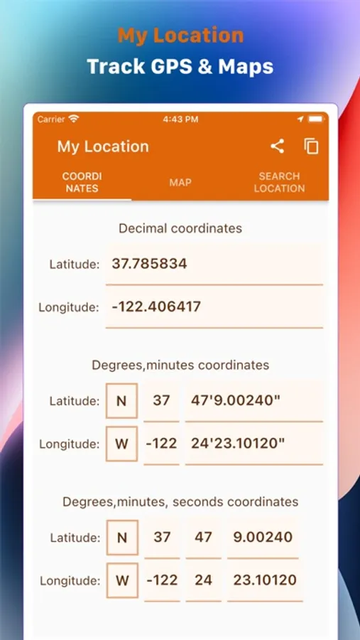 • Copy and Paste: Seamlessly copy your coordinates to your device's clipboard and paste them into any other application or messaging platform. This feature saves you time and effort by eliminating the need for manual entry, ensuring accurate location sharing with a single tap.
