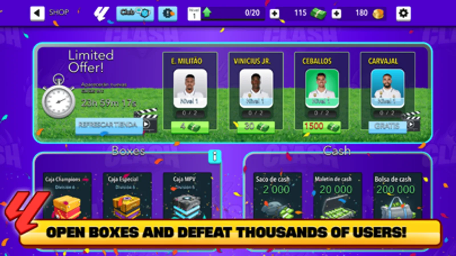 • Use champion boosters to give your team the strategic advantage and defeat your rivals. Battle against other players online to show who is the true goal king in "LaLiga Clash". Make player transfers until you have the perfect collection. Find your ideal partner and beat your adversaries.