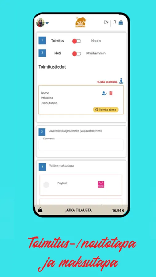 Sovelluksessa sinulla on mahdollisuus valita erilaiset maksutavat. Meillä on käytössä: