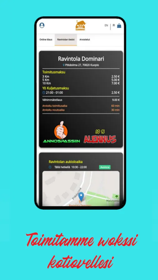 Ravintola Dominari, sovelluksesta löydät kaikki ravintolan valikoimat edullisesti ja parhain tarjouksin! Voit tilata ennakkoon, noutaa ravintolasta tai nauttia kotona. Sovelluksen avulla apu löytyy parhaiten jokaiseen tilanteeseen.