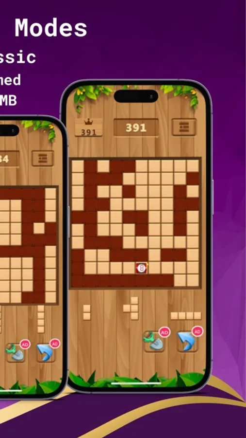 In the woody style block puzzle game, you have to rotate pieces to help you grow your score. There is a section we call holders to place aside a block piece for later use. It makes the game more interesting to play than other block games. The cube block game is really fun to play and useful for brain training.