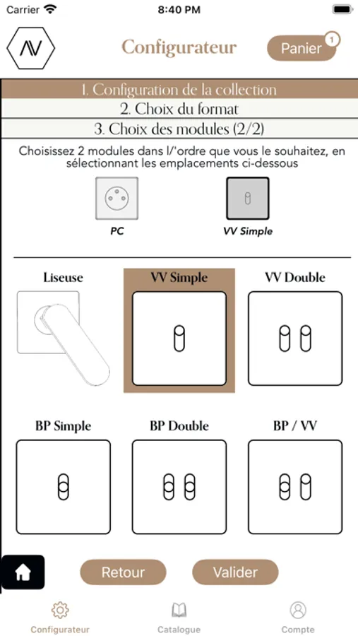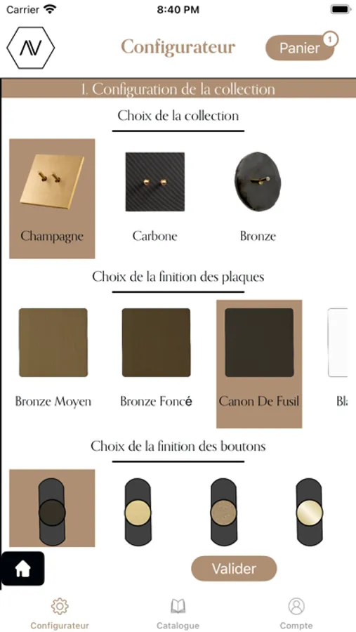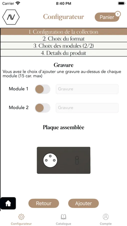 A partir de l'application Auxilium, configurez totalement votre besoin d'aménagement intérieur avec le catalogue Augvste (prises, boutons et plus encore !)