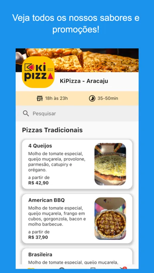 Com o aplicativo da KiPizza, você pode fazer seus pedidos com muito mais facilidade e comodidade. Localizada em Aracaju, oferecemos mais de 30 sabores diferentes de pizza, além de várias opções de pizzas doces, tudo isso a um clique de distância.
