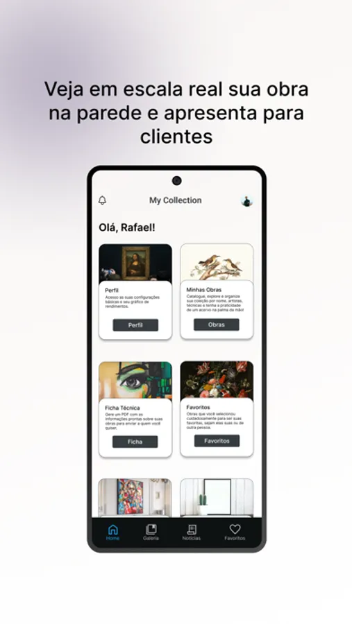 Carregue em seu bolso toda a sua coleção, independente de qual seja, e ganhe a praticidade de apresentar esses trabalhos em qualquer lugar. Com o MyCollection você terá toda essa praticidade, poderá ver sua obra em escala na parede, fazer PDF's de apresentação, separar as obras do jeito que quiser, além de ficar sempre atualizado sobre o que acontece no mundo das artes, como exposições, cursos, vagas e muito mais!