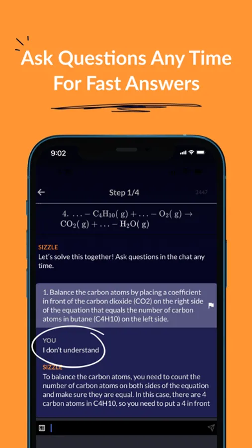 - Chat for help and clarification - At any point, if you’re feeling stuck, as Sizzle to explain differently, or to define a term, or just to explain the underlying concepts to you. Sizzle is like a tutor or study buddy here to meet you wherever you on your learning journey.