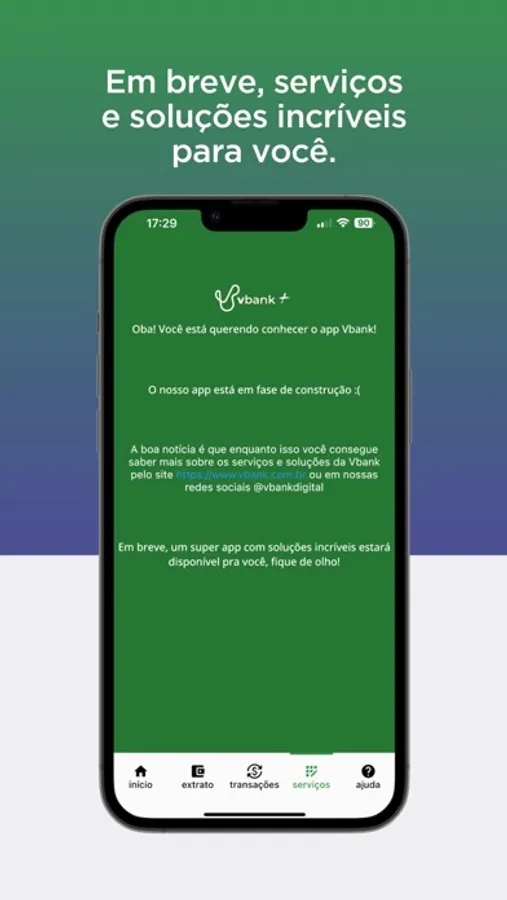 O VBank+ nasceu com intuito de oferecer conta digital e produtos financeiros de forma 100% online, sem burocracias, com segurança e tecnologia de ponta.