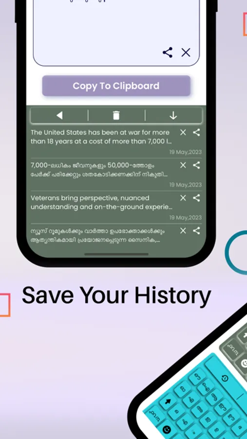 You can save your Malayalam text inside application it self. You can use your text for later use too.