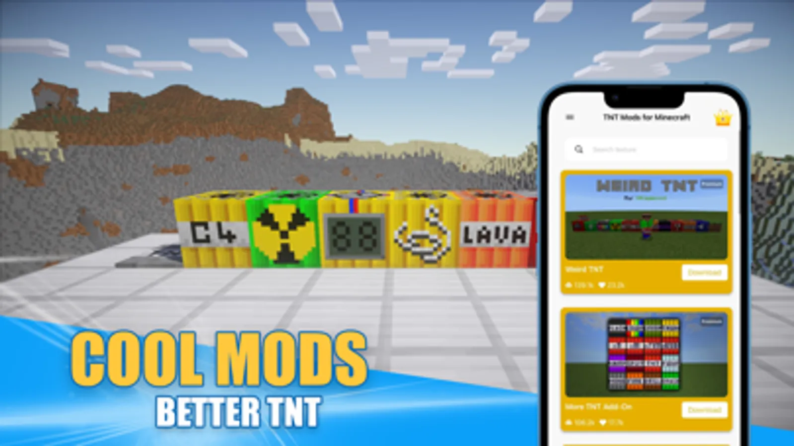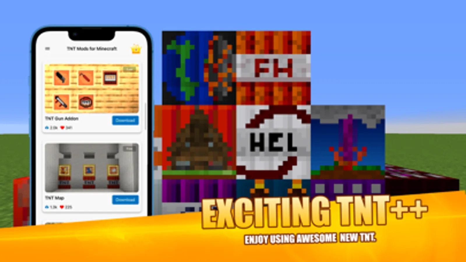The famous Addon too much TNT mod for mcpe , we add an option to download and install skins & mod with TNT, and you can use that in game , all this just to make your favorite game characters better and share to your friends or your family to make a simple skins and mod for Minecraft game with your idol TNT Addon.