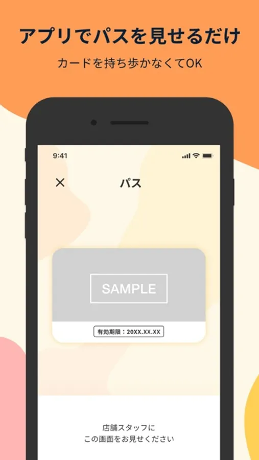 アプリの「パスを見せる」ボタンをタップした画面を、店頭などで提示するだけで特典やサービスを受けられます!