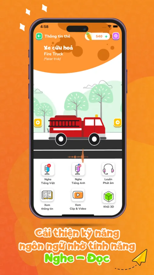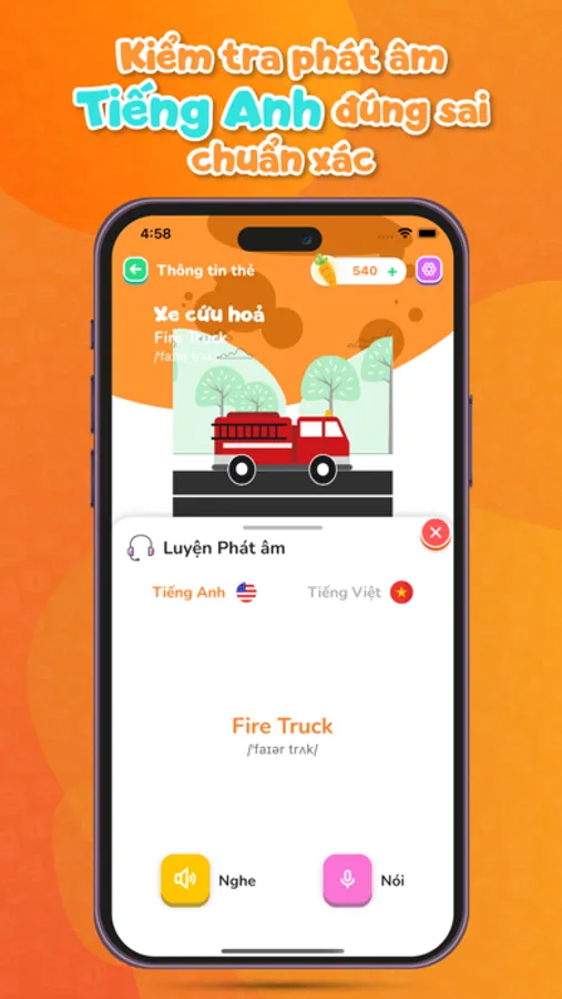 - Tích hợp song ngữ Anh - Việt, đánh giá phát âm đúng sai