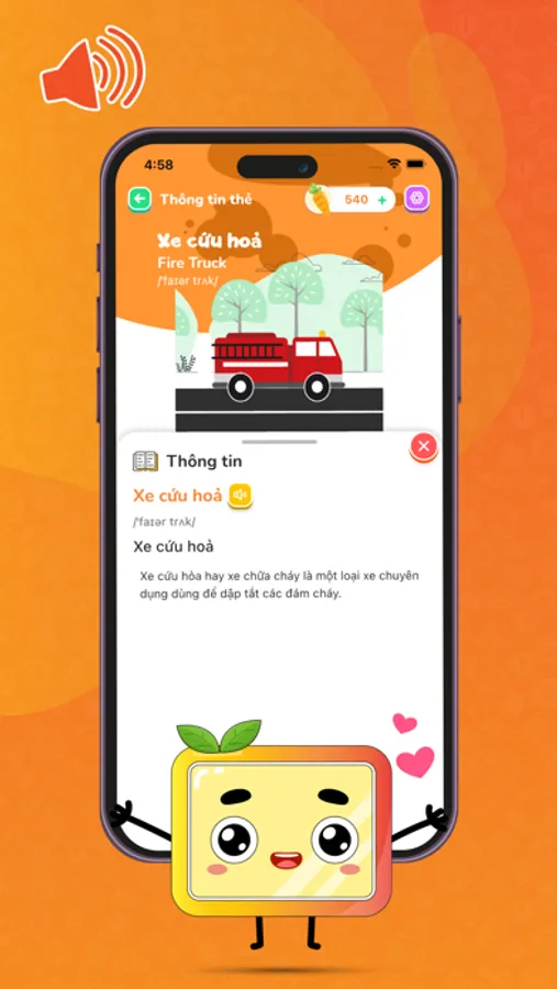 Ngoài ra KinderCards hỗ trợ tính năng song ngữ Anh - Việt, công cụ đánh giá phát âm đúng chuẩn người bản xứ để giúp các bé hiểu và học tiếng Anh dễ dàng và tự nhiên hơn. Với tính năng này, bé sẽ có cơ hội trau dồi khả năng ngôn ngữ của mình một cách toàn diện.