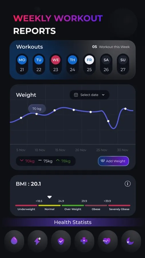 To help you track your progress and understand your body composition, SuratFit includes a Body Mass Index (BMI) feature. This feature provides an overview of your weight relative to your height, giving you a valuable metric to gauge your overall health.