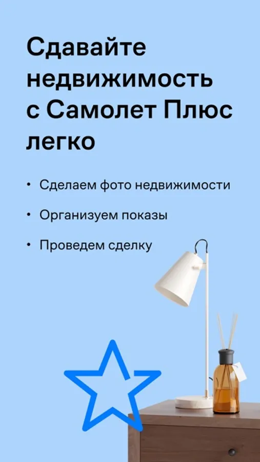 Снимать с Самолет Плюс выгоднее, чем напрямую у собственника. Вам не придется платить залог, а комиссию можно отдавать частями в срок до 6 месяцев. Если сломается мебель или техника, расходы на ремонт покроет страховая. Оплата аренды — онлайн в приложении, чтобы лишний раз не встречаться с собственником.