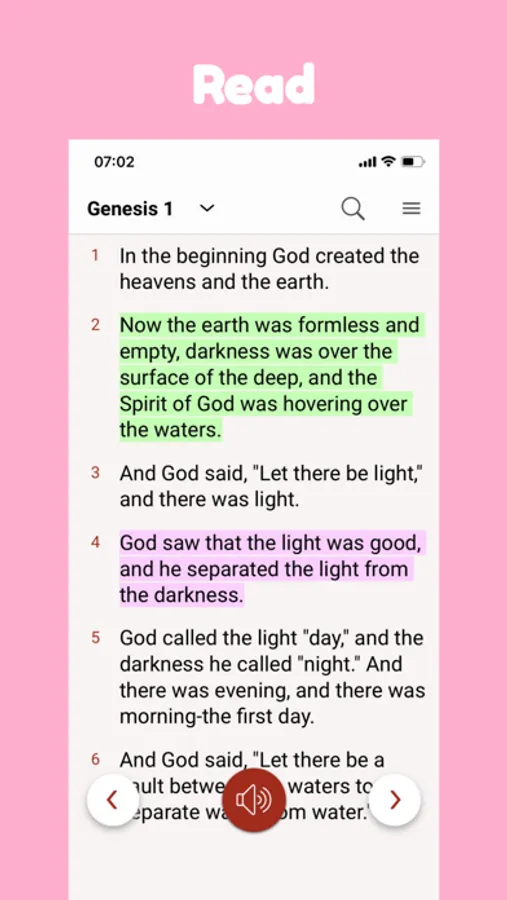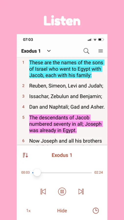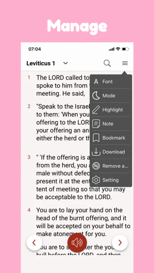 • Audio Bible feature allows you to listen to the Bible even without internet access