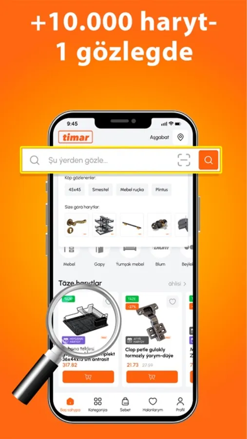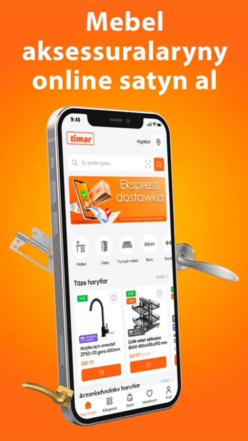 Marketimiz 12 ýyldan gowrak wagt bäri mebel aksessuarlary bazarynda uly abraýdan peýdalanýar. Ussat mebelçilerimiziň gurnaýan nepis, gözegelüwli aşhanadyr, garderoblaryň - dürli görnüşli şkaflardyr ýumşak mebelleriň döredýän rahatlygyndan, gelşiginden halk köpçüligi örän hoşal. Şeýle rahatlygyň, şeýle nepisligiň özeninde bolsa Timar mebel aksessuarlary marketiniň hyzmaty, zähmeti, aladasy bar. Şeýle alada bilen hyzmatymyz Onlaýn görnüşinde hem alnyp barylýar. Indi müşderilerimiz gysga wagtyň içinde, oturan ýerinde islän harydyny sargyt edip bilýärler.