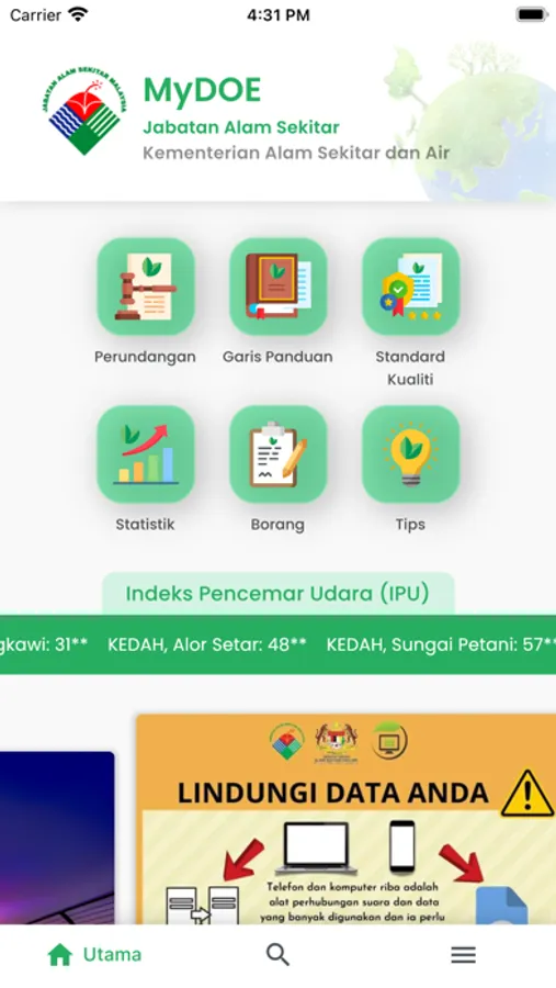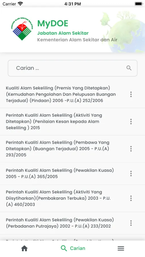 MyDOE is an application developed by the Department of Environment on behalf of Government Malaysia which to facilitate public in providing information and knowledge related to environment in the country. It helps users to have a better understanding of laws, guidelines, quality standards, statistics and tips on the environmental issues.