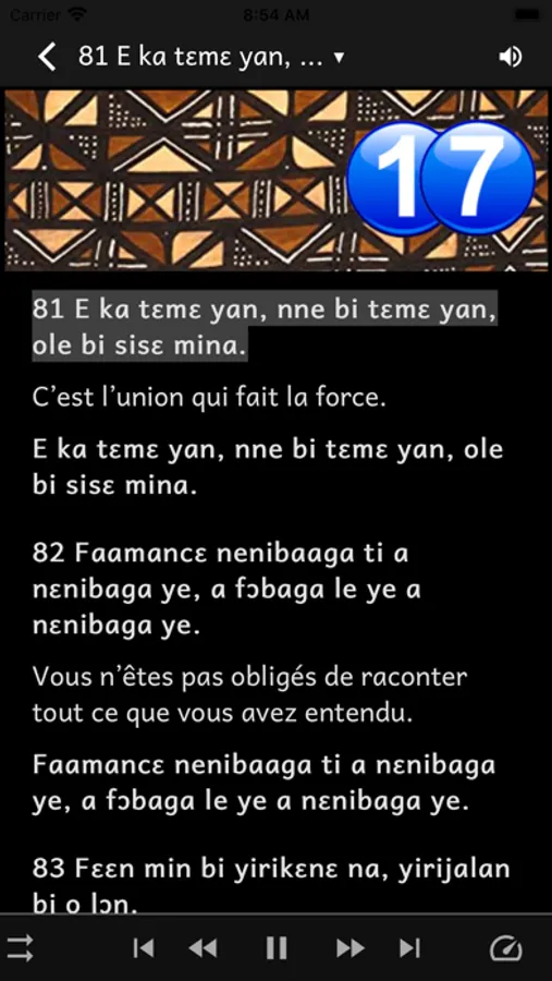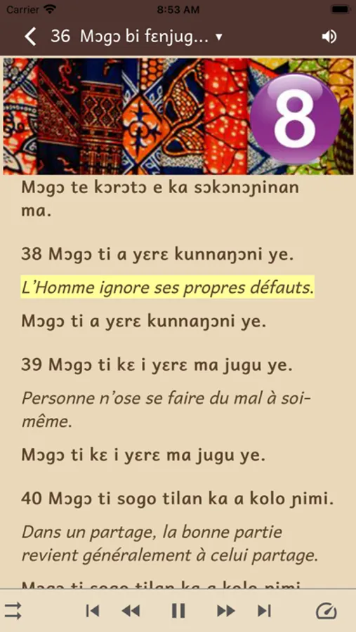 Cliquez sur le petit haut-parleur en haut à droite et sur «Play» pour écouter les proverbes lu pour vous. Beaucoup de personnes dioula-phones expriment leur conception de la vie à travers de contes et des proverbes. C'est grâce à cette sagesse que les ancêtres sont parvenus à éduquer leurs enfants. Avec les proverbes on entre profondément dans l'âme du peuple, on saisit sur le vif ses impressions, ses idées, ses sentiments, ses règles de vie. Les proverbes cristallisent pour ainsi dire la sagesse d'un peuple.