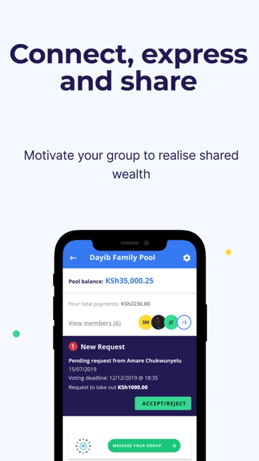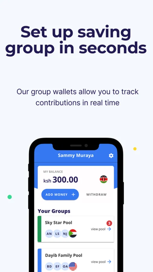 Set up a savings group in seconds and use our AI-powered chat to agree on goals and create simple agreements. You can approve new members, track contributions, and authorize withdrawals.