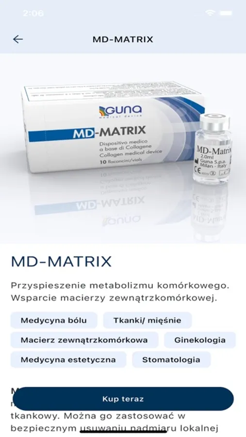 1. Informacje na temat produktów - aplikacja zawiera szczegółowe informacje na temat kolagenowych wyrobów medycznych włoskiej firmy GUNA. Dzięki niej uzyskasz łatwy dostęp do opisów produktów, wskazań do ich stosowania, składów, sposobu użycia oraz innych ważnych informacji, które pomogą Ci w podjęciu właściwej decyzji terapeutycznej.