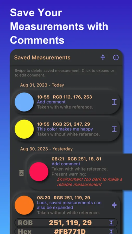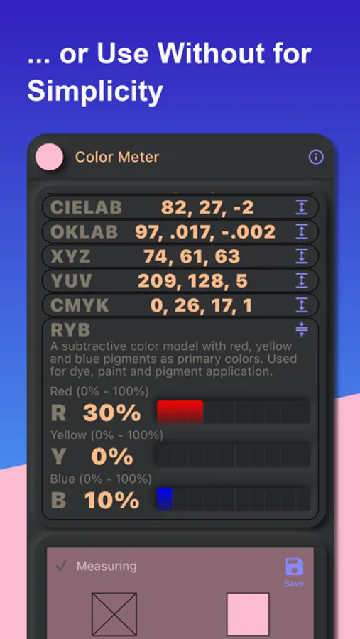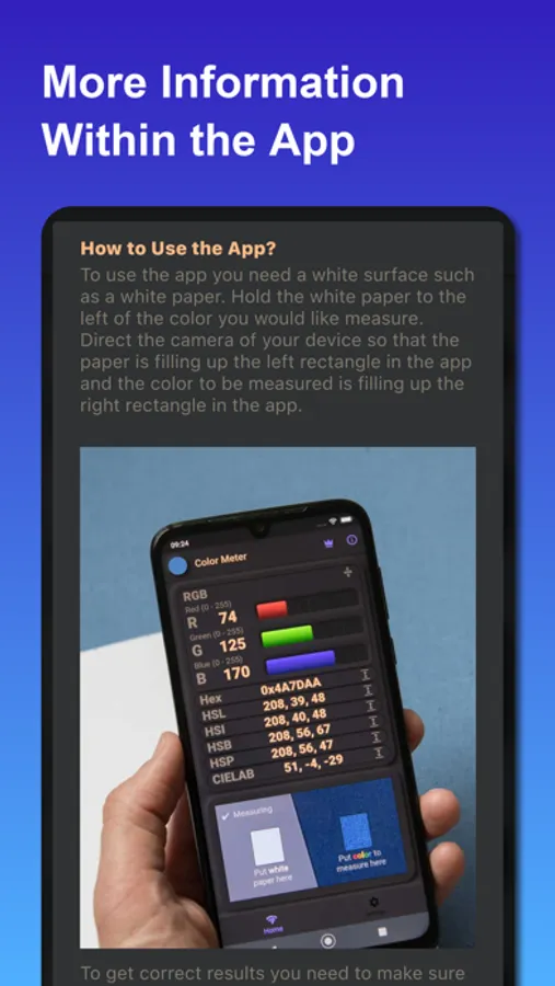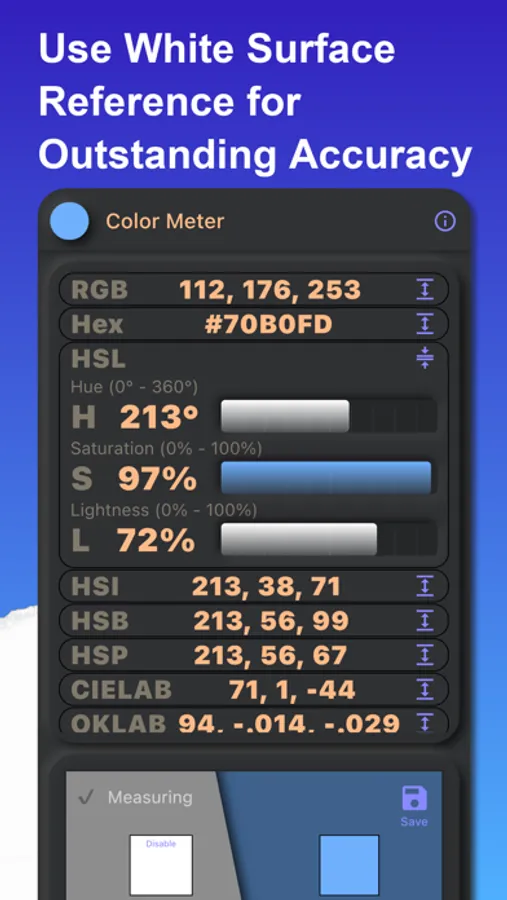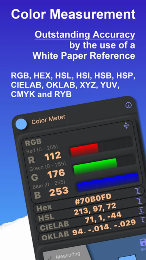 What sets Color Meter apart from other apps is its ingenious use of a white paper reference. By compensating for the color and intensity of the ambient light, Color Meter ensures that the color measurements are more precise and reliable. It is like having a professional meter in your pocket.