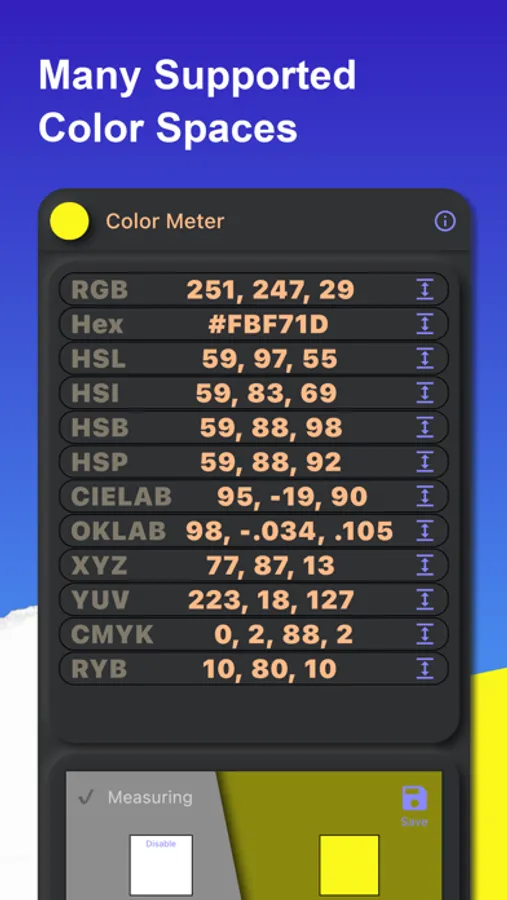 Color Meter currently supports RGB, RGB in Hex format, Hue/Saturation based color spaces HSL, HSI, HSB and HSP as well as LAB (CIE LAB), XYZ, YUV and the subtractive color models CMYK and RYB. Are you missing any color space? Let me know at apps@contechity.com and I try to add it. You can see them all at once or click on the ones you are most interested in for an enlarged view and graphical representation of them.