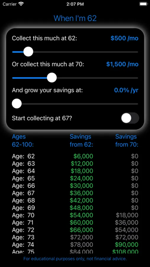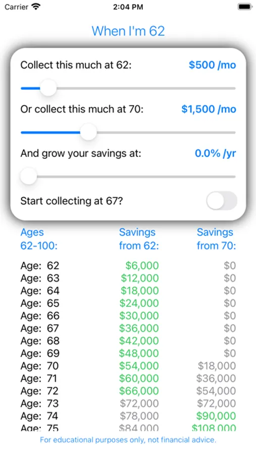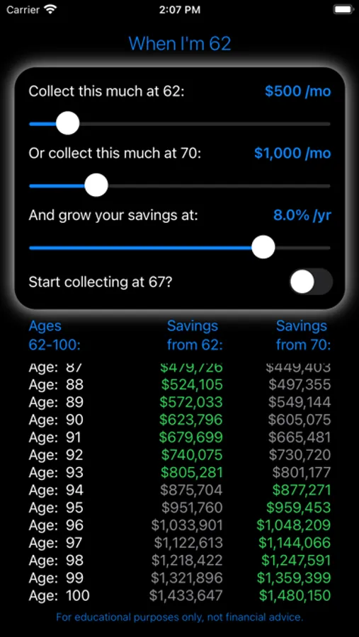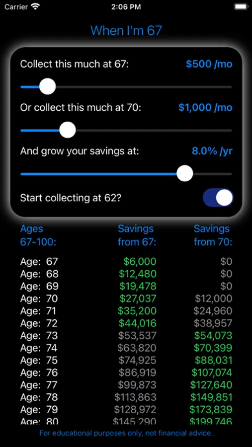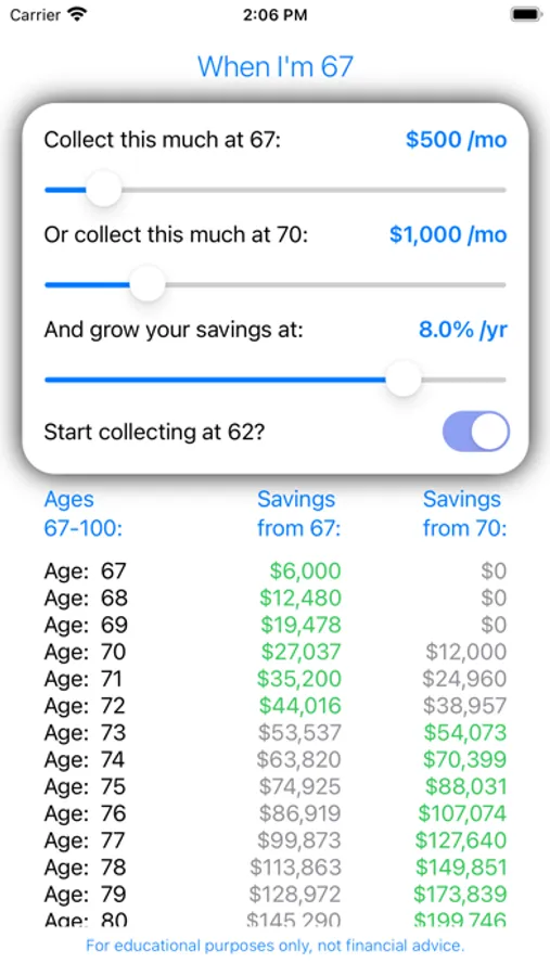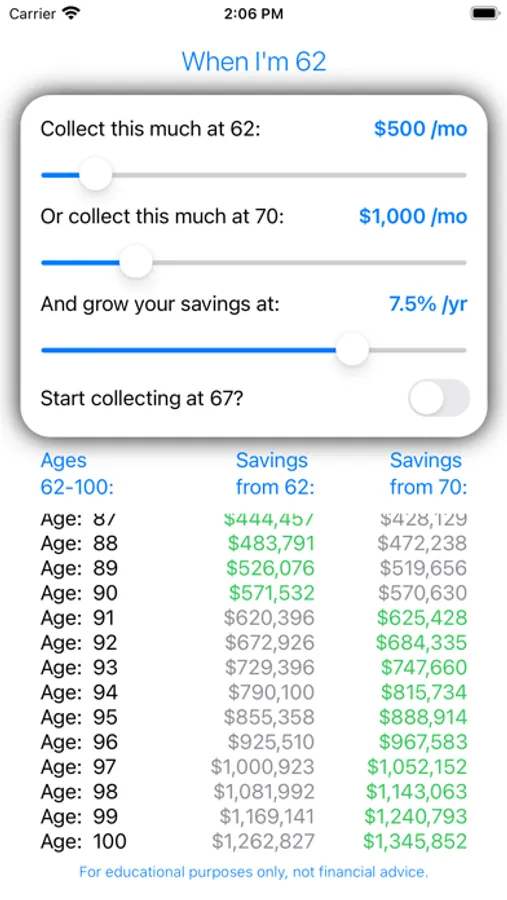If you added up all your social security checks, how much would you get? If you put all your social security checks in a savings account, how much would you have after 10 years? Is it better to start collecting social security at 62 or wait until 70? That depends on how fast you can grow your savings. Use this quick calculator to see your total savings for each year. See for yourself which is better. Quickly slide to adjust your monthly amount. Quickly slide to choose your interest rate. Quickly scroll to see how much your savings is worth at ages 62 to 100. Quickly press a button to change your starting year from 62 to 67.