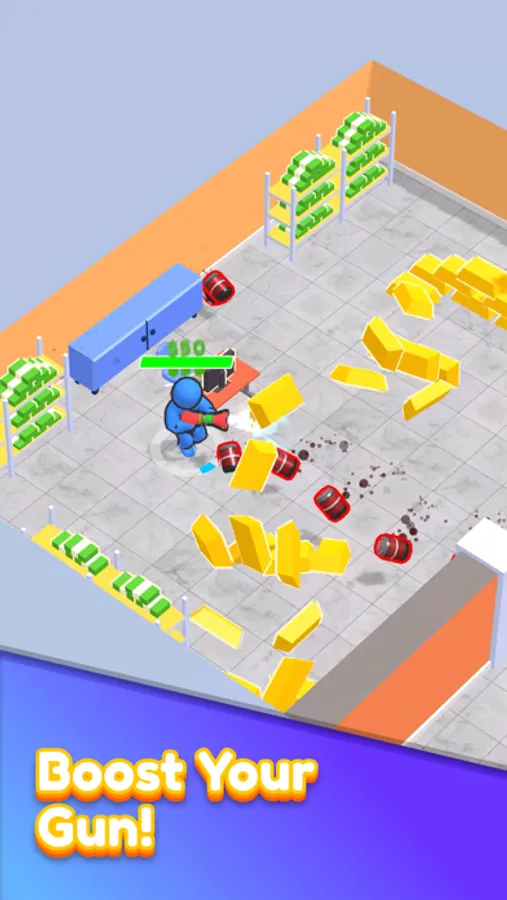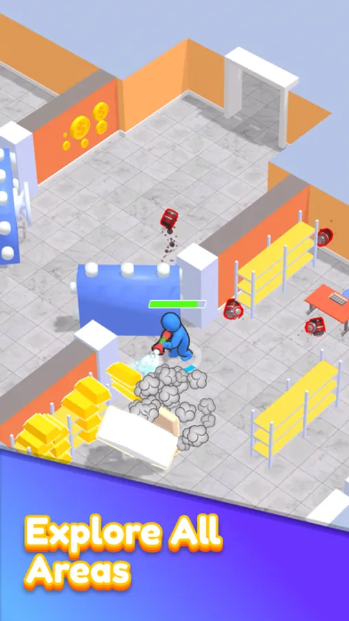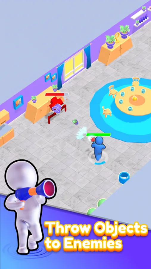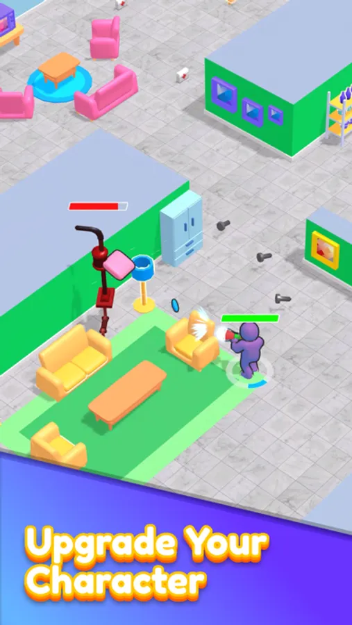 But trust your ultra mega boosted vacuum gun: it will hoover even a lunatic refrigerator, let alone a dust granule! Use the joystick to vacuum and stack every single stuff, throw them back to your crazy attackers, then enjoy the simplicity of the clean and empty rooms!