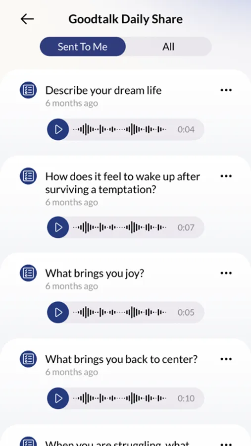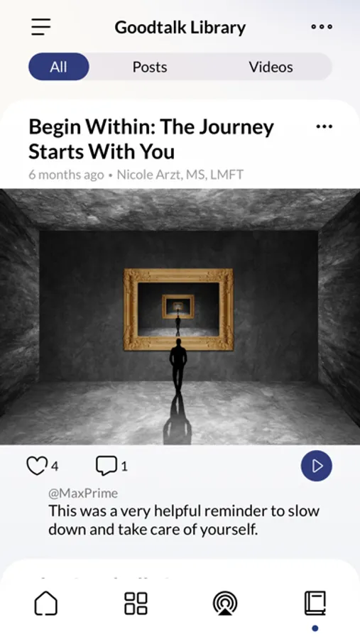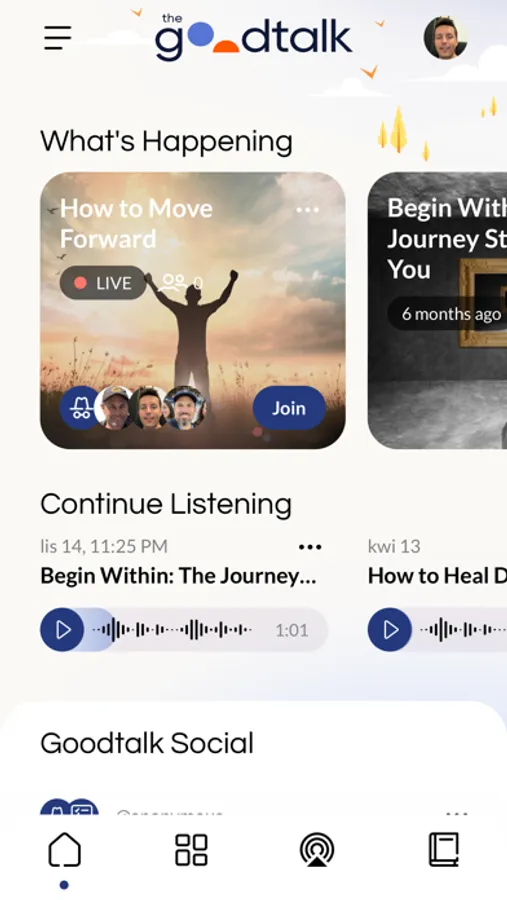 Through The Goodtalk app, users are able to support one another by participating in Goodtalk Audio Rooms (either with their profile known or anonymously through the Goodtalk incognito mode), sharing moments on the Goodtalk Social Feed by posting images and video, sharing an audio response to one of the provocative Goodtalk Daily Share prompts (or the response may be kept in a private Audio Journal). Explore other in-app resources within the Goodtalk Library such as blog posts and inspirational video.