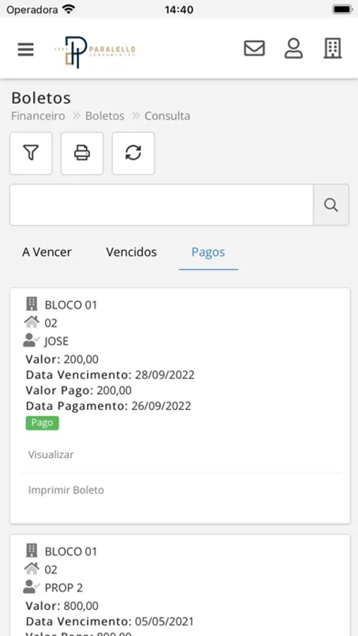 - Visualização de boletos em aberto para sua unidade;