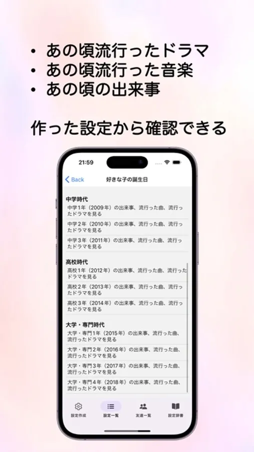 それだけでなく、「(この誕生日の人が)高校1年生のときに起こった出来事」や「高校1年生のときに流行った音楽・ドラマ」なども確認できます。