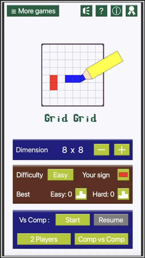 Grid Grid is a paper pencil game which 2 players fill 2 adjacent grids alternatively, the one who bounds an empty grid at 4 sides is the winner!